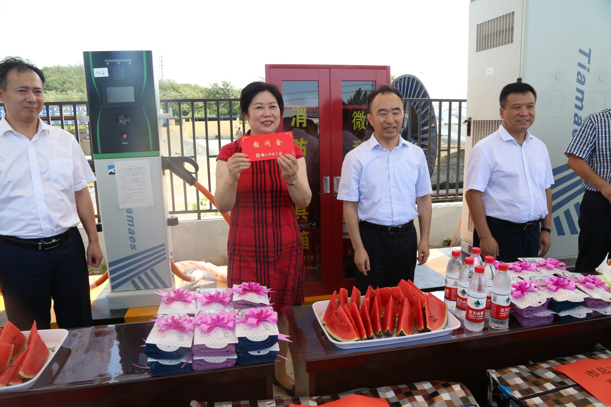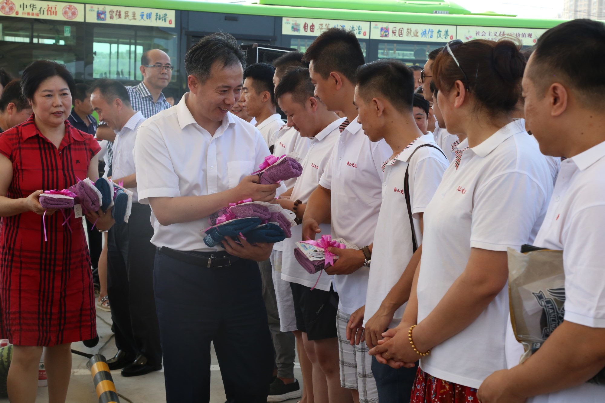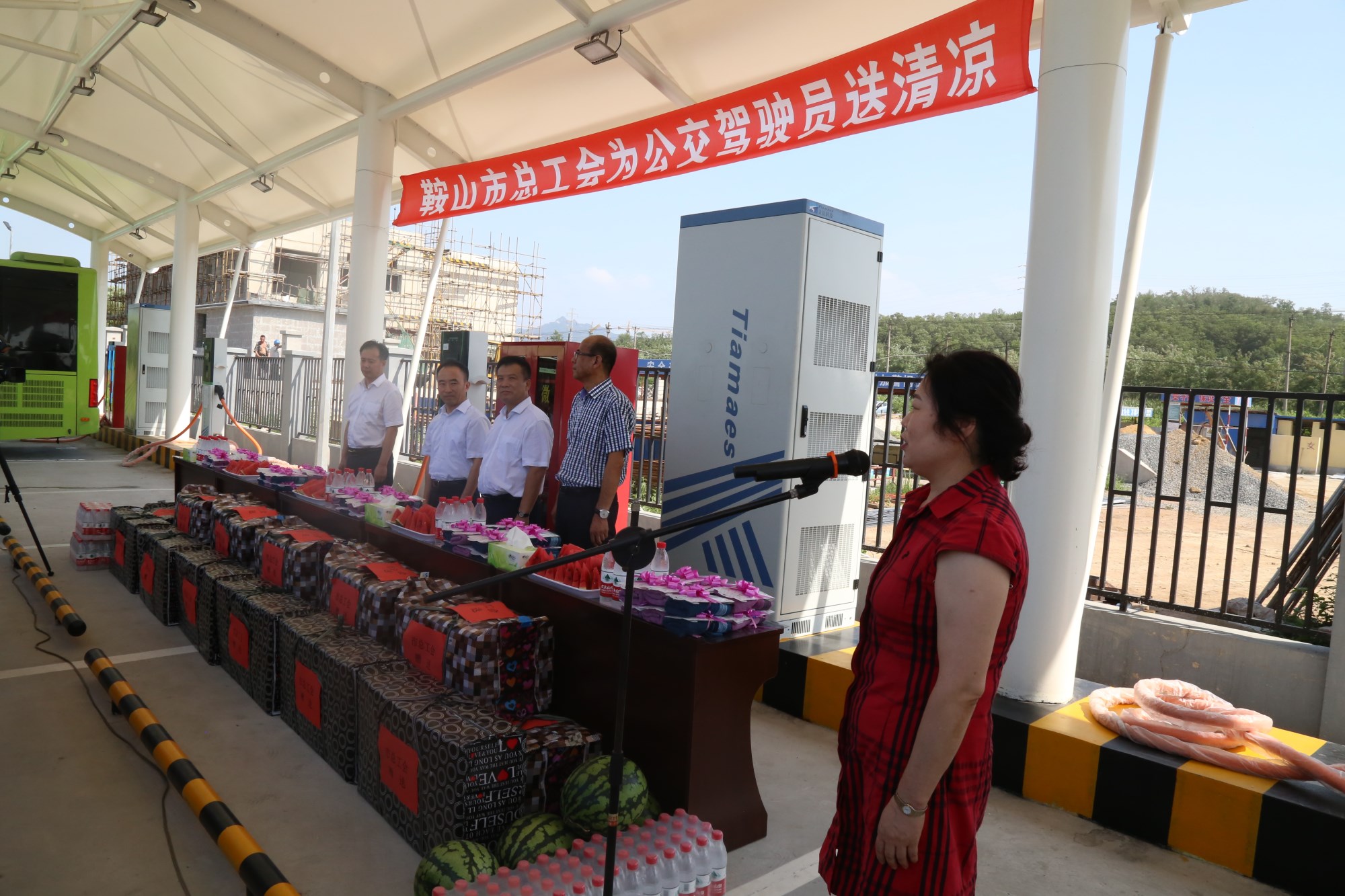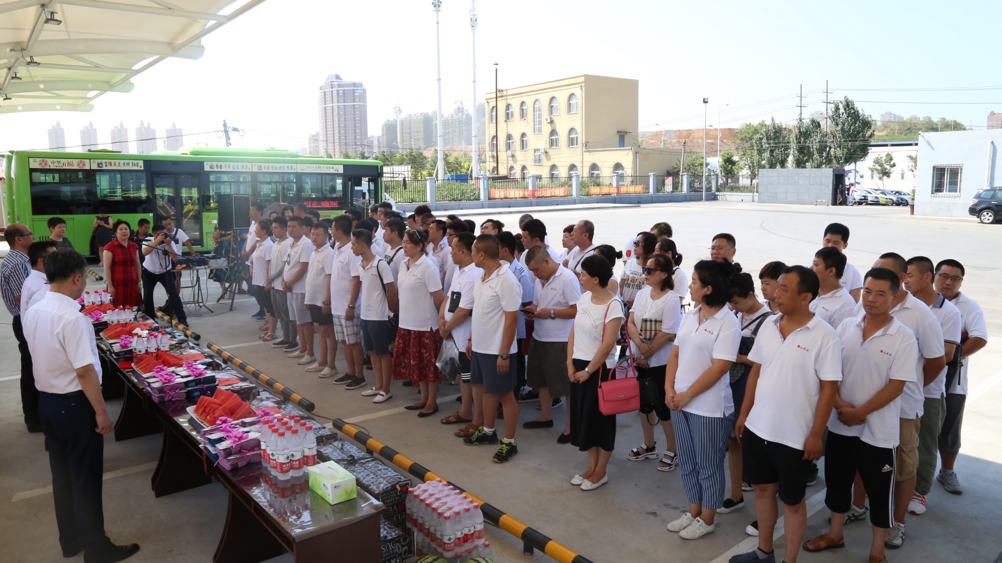2018年8月1日下午,鞍山市總工會在交運集團第二汽車分公司216路終點站舉行了為公交一線駕駛員送清涼活動。鞍山市人大常委會副主任、市總工會主席解永孚;市總工會副主席李展程;市國資委黨委書記、主任顧洪新等領(lǐng)導(dǎo)來到216路調(diào)度室看望了交運集團一線駕駛員,為他們送去夏日里的清涼與工會組織的慰問。交運集團黨委書記、董事長羅玉艷;總經(jīng)理王春江;黨委副書記、紀(jì)委書記、工會主席金秀石出席了活動;顒又,交運集團黨委書記、董事長羅玉艷向市總工會領(lǐng)導(dǎo)介紹了企業(yè)生產(chǎn)運營情況,并代表集團職工向市總工會表示感謝。隨后,市總工會主席解永孚代表市總工會對高溫酷暑中仍堅守崗位、辛勤工作的交運一線職工致以親切的問候,希望交運集團廣大職工繼續(xù)發(fā)揚艱苦奮斗、愛崗敬業(yè)精神,注意防暑和行車安全,以更好的狀態(tài)投入到工作中服務(wù)好市民乘客,并將市總工會撥付的2萬元慰問金交到交運集團董事長手中。第二汽車分公司2路線駕駛員謝金紅在活動中代表一線駕駛員作了表態(tài)發(fā)言。最后,各級領(lǐng)導(dǎo)在現(xiàn)場親手將交運集團工會為一線職工準(zhǔn)備了冰袖、毛巾、西瓜、冰鎮(zhèn)礦泉水等慰問物資發(fā)到職工手中。