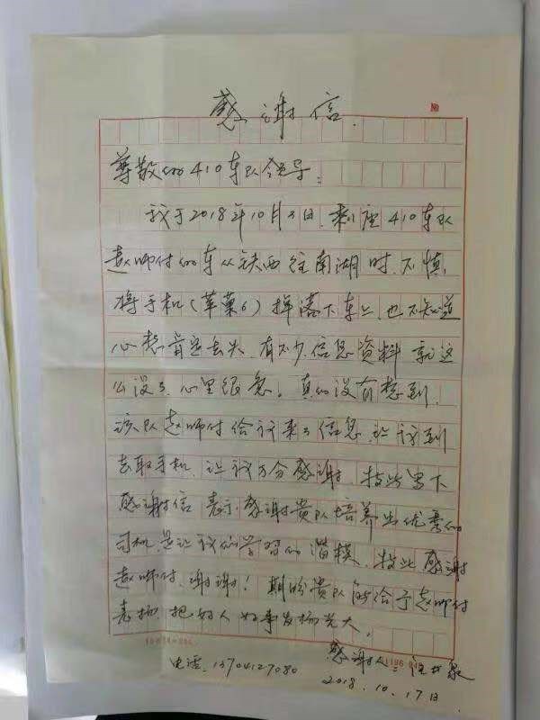 5.2018年10月16日,汪先生乘坐410線2061號駕駛員趙正博師傅車從鐵西往南湖走時,不慎將手機(jī)掉到了車?yán),下車后,汪先生很是著急,因為手機(jī)內(nèi)有不少信息,正在焦急中,趙師傅拾到他的手機(jī)給他的家人去了信息,并把手機(jī)交到410線調(diào)度室,汪先生帶著表揚信來到調(diào)度室,調(diào)度及時把手機(jī)還給了失主,汪先生連連感謝,感謝貴公司培養(yǎng)出這樣優(yōu)秀的駕駛員。